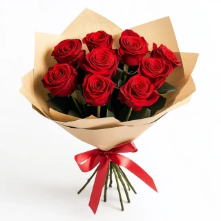 Этот букет из девяти красных роз — настоящий символ любви и страсти. Каждая роза, с яркими и насыщенными лепестками, излучает тепло и нежность, создавая атмосферу романтики. Их изысканная форма и глубокий цвет привлекают внимание и дарят радость. Букет оформлен в стильной крафтовой упаковке, которая добавляет нотку естественности и утонченности. Простой, но элегантный дизайн подчеркивает красоту самих цветов и создает гармоничное сочетание с их яркостью.