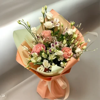 Этот букет "Безмятежность" наполнен нежностью и спокойствием. Он объединяет в себе прекрасные розы, элегантные лизиантусы и веселые альстромерии, создавая прекрасный объем и гармонию. Каждый цветок в этом букете выражает любовь, нежность и радость. Упакован в мягкую и нежную обертку, букет "Безмятежность" станет идеальным подарком для тех, кто хочет передать красоту, умиротворение и тепло своим близким. Он добавит нотки любви и радости в любое особое событие или просто поднимет настроение в повседневной жизни.