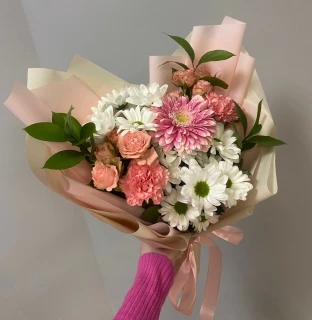 Этот изящный букет воплощает в себе нежность и свежесть природы. Ромашковые хризантемы, символизирующие чистоту и верность, дополняются кустовыми розами, излучающими чувственность и романтичность. Гвоздики, олицетворяющие стойкость и силу, привносят нотки элегантности и страсти. А гербера нежно раскладывает свои лепестки, символизируя вечную красоту и чувственность. Упаковка букета подчеркивает его неповторимость, украшая его элегантностью и изяществом. "Драгоценные камни" - это букет, способный привнести в жизнь нежность, романтику и эмоции, заставляющие сердце трепетать.